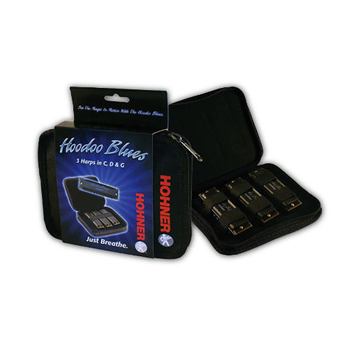 Named for the Junior Wells blues classic "Hoodoo Man Blues,” Hohner introduces the Hoodoo Blues 3 pack. Tuned to the keys of C, D and G, the HooDoo Blues Diatonic harmonicas feature, 10 holes, brass reeds and includes a zippered carrying bag made with tolex material to bring your HooDoo harmonicas to every jam. Brass reeds offer the ultimate in blues