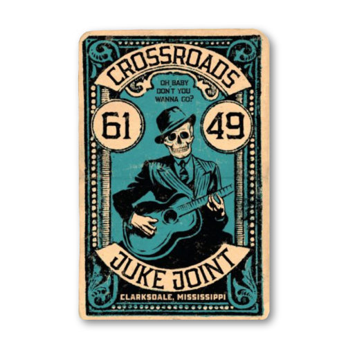 Original artwork by Grego in vintage style references the legend of the crossroads, where Robert Johnson was alleged to have sold his soul to the devil to be able to play his magical blues. 12” x "18” digital print on 80 lb. paper stock.